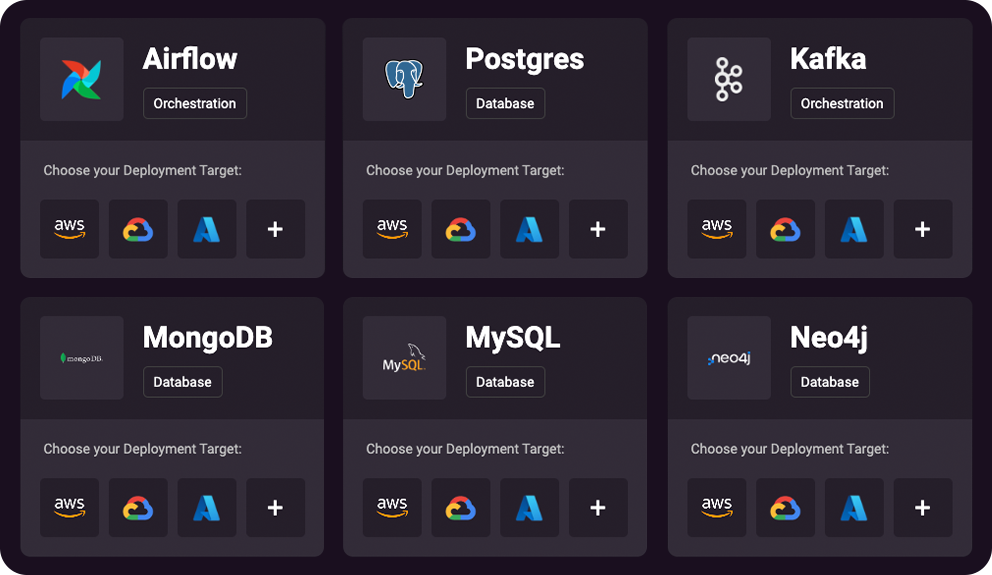 Easily deploy any application in our Template library to a supported cloud destination in minutes. Templates are a CNDI concept, and they can be thought of as a "blueprint" for a data stack, built on top of ArgoCD, Helm Charts, and Terraform. Check out all our supported templates below.
